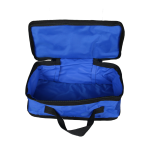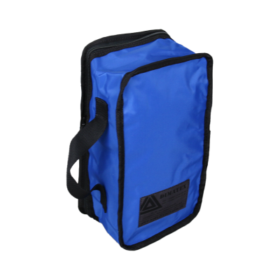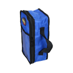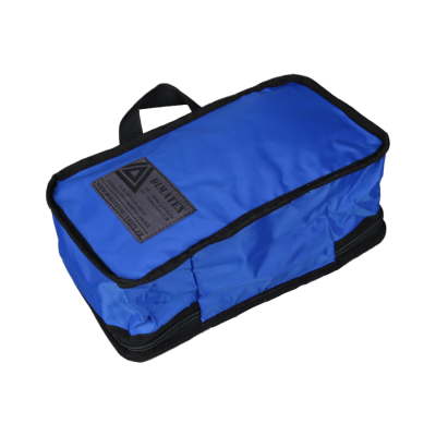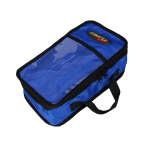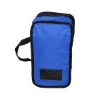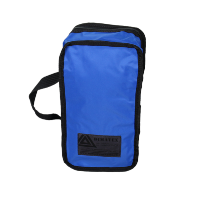 Versatile blue pouch made of durable and functional 420D polyamide. Features include shock-absorbing padded sides, one external Velcro closure, a carrying handle, and a front document holder for long-lasting professional use.
