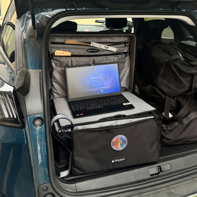Sangles de fixation pour transport, quatres boucles plastiques externes permettant le portage en bandoulière et la fixation dans le coffre grâce à une sangle ajustable compatible avec les appuis-tête du véhicule
